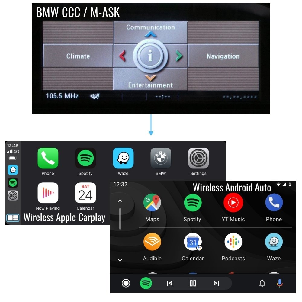 BMW CCC / M-ASK Multimedia Upgrade – adds modern Apple CarPlay and Android Auto while keeping the factory BMW display.
