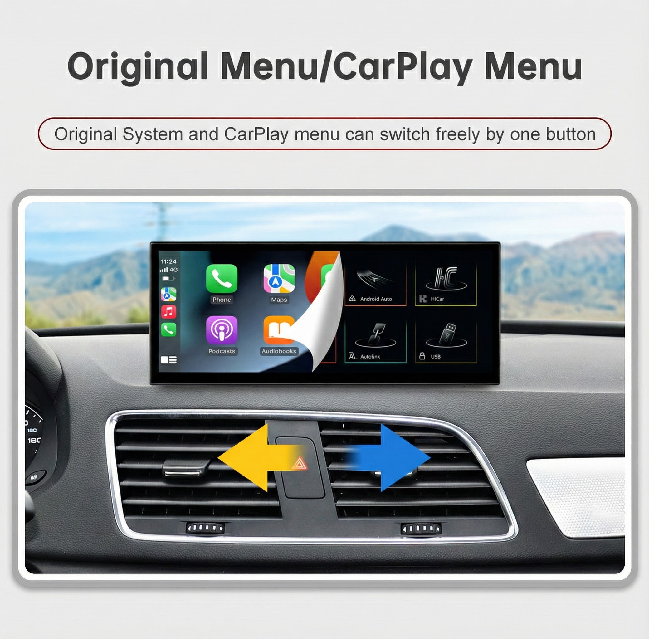 Switch instantly between the factory Audi MMI interface and CarPlay/Android Auto at any time.