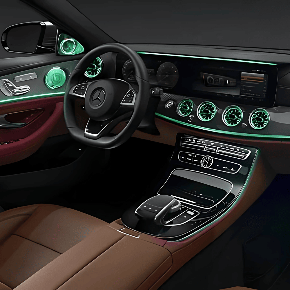 Transform the cabin of your Mercedes-Benz into a modern sanctuary of light and color with our EQS-inspired LED ambient air vent lighting kit. This premium upgrade infuses your E-Class interior with the same futuristic elegance found in the flagship EQS, creating a personalized and immersive driving environment. Engineered with high-quality, durable LEDs, this comprehensive set illuminates both front and rear air vents, casting a sophisticated glow that enhances nighttime visibility and elevates the entire aesthetic of your vehicle’s cockpit. Designed for seamless integration, this plug-and-play system offers effortless control over 64 vibrant colors, allowing you to tailor the ambiance to match your mood or style for a truly bespoke luxury experience.
