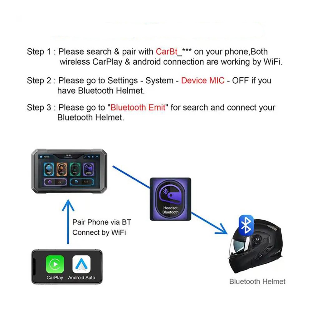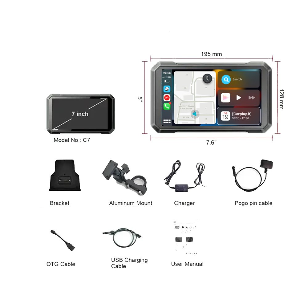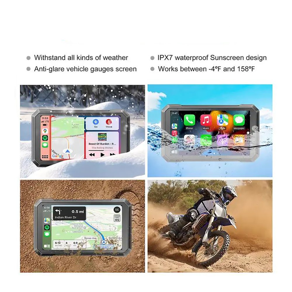 The IPX7-rated screen is resistant to rain, dust, and heat, while the high-performance 4-core 64-bit Cortex A53 processor and high-sensitivity GPS antenna ensure stable operation and accurate positioning. Say goodbye to phone stands, protect your devices from vibration damage, and enhance the look of any motorcycle. Compatible with iPhones (iOS 12+) and most Android phones (Android 12+), and suitable for all types and sizes of motorcycles, typically mounted around the handlebars.
